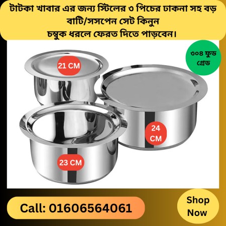 প্রিমিয়াম প্রোডাক্ট১০০% স্টিলের 3 পিস খাবার সংরক্ষণ করার বড় বাটি ঢাকনা সহ । পণ্য হাতে পাউয়ার সময় চুম্বুক দিয়ে চেক করে নিবেন।