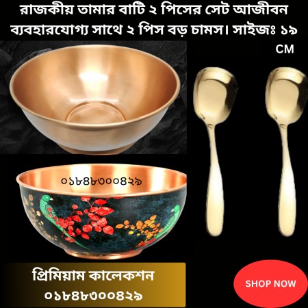 ২ পিস তামার বাটি Black এবং 2 পিস বড় steel golden Spoon ( 100%Copper) 19 Cm (১ পিস প্রিন্ট ১ পিস প্রিন্ট ছাড়া)