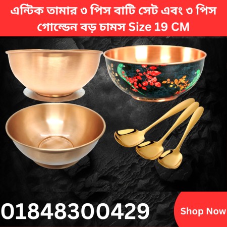 3 পিস তামার বাটি Black এবং 3 পিস বড় Steel Golden চামস (100% Copper) Bowl 19 Cm (১ পিস প্রিন্ট ২ পিস প্রিন্ট ছাড়া)